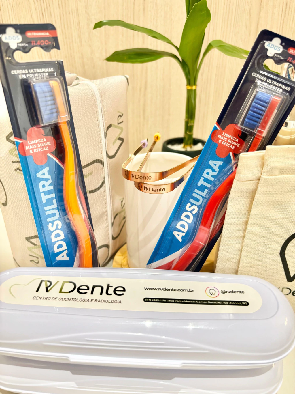 2 Raspadores de Língua RV Dente + 2 Escovas Ultra (cores sortidas) + 2 Estojos + 2 Bolsinhas + 2 Identificadores + 1 Nécessaire