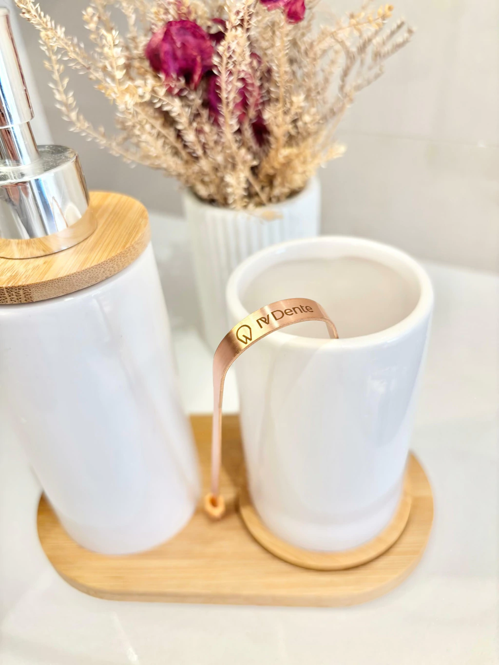 Cuide da sua saúde bucal com o Raspador de Língua em Cobre da RV Dente. Raspar a língua ao acordar é um hábito importante para uma higiene bucal completa.
